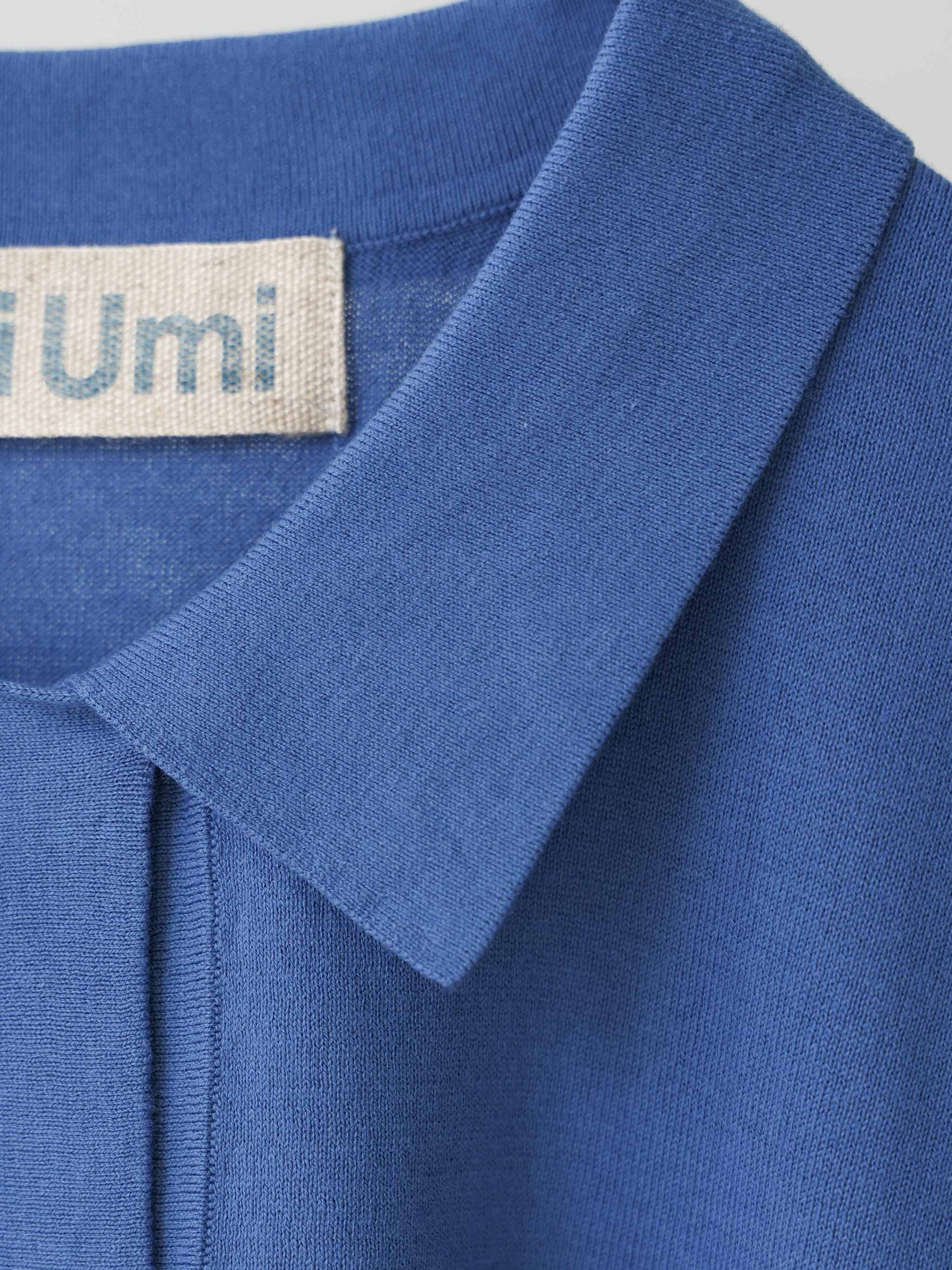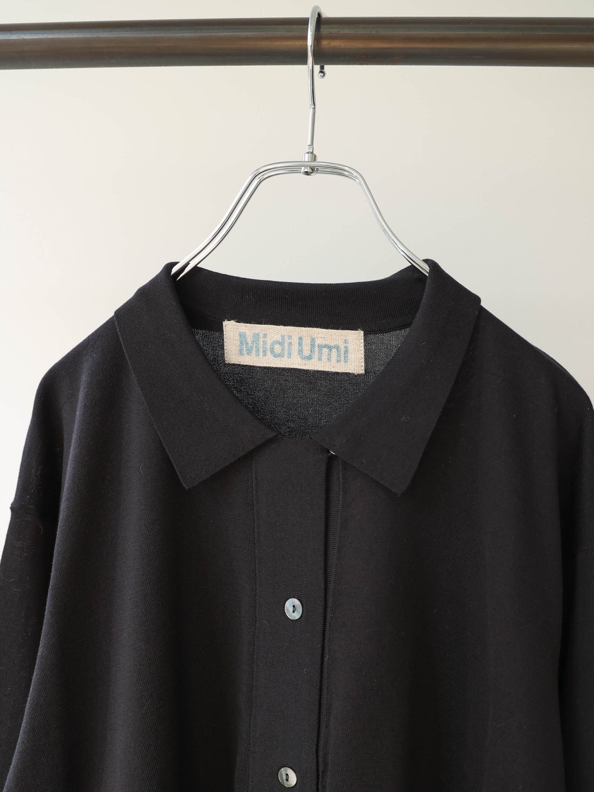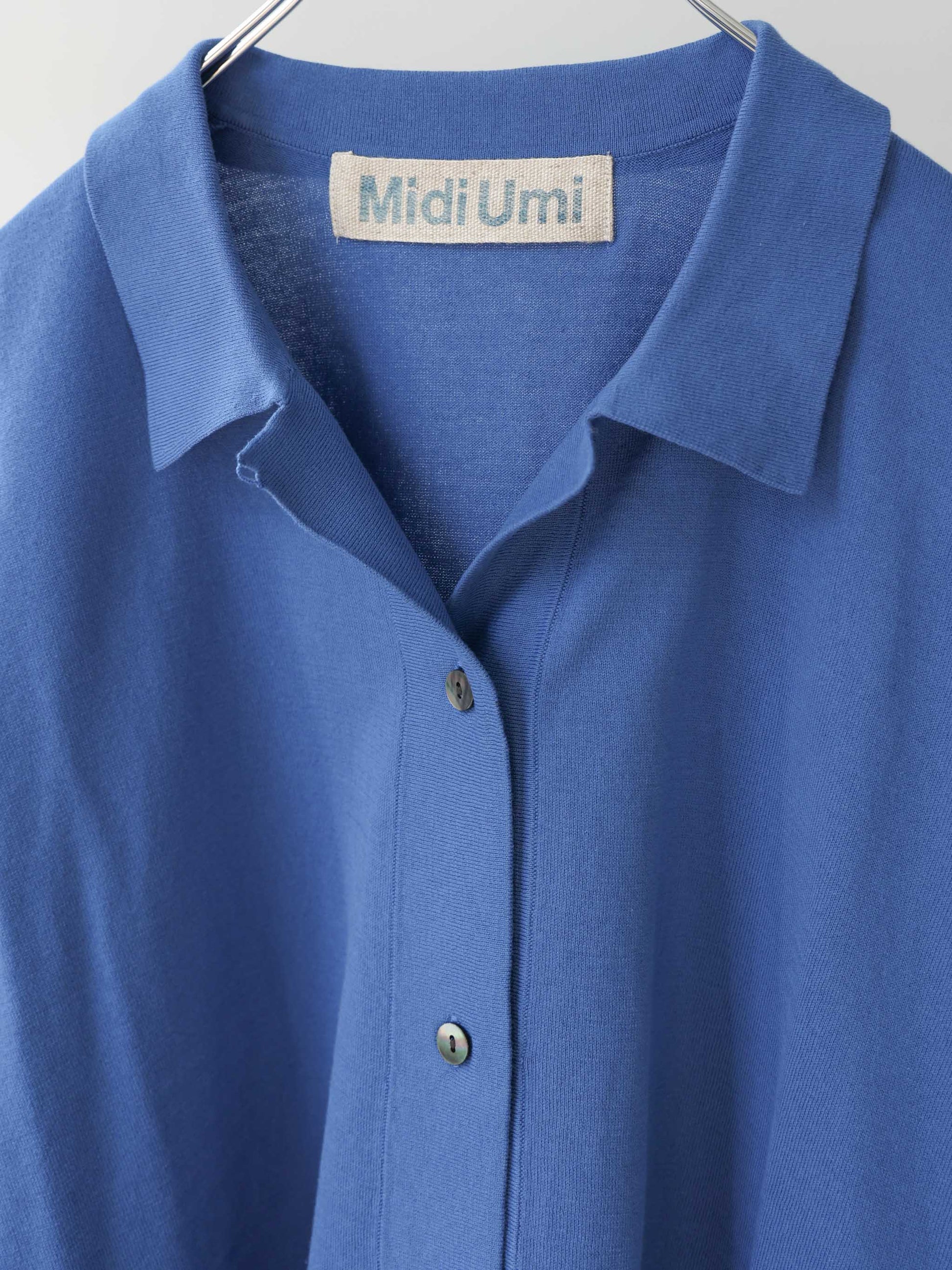 ベルトラインまでの丈感で、シャツ襟付きのニットカーディガン。