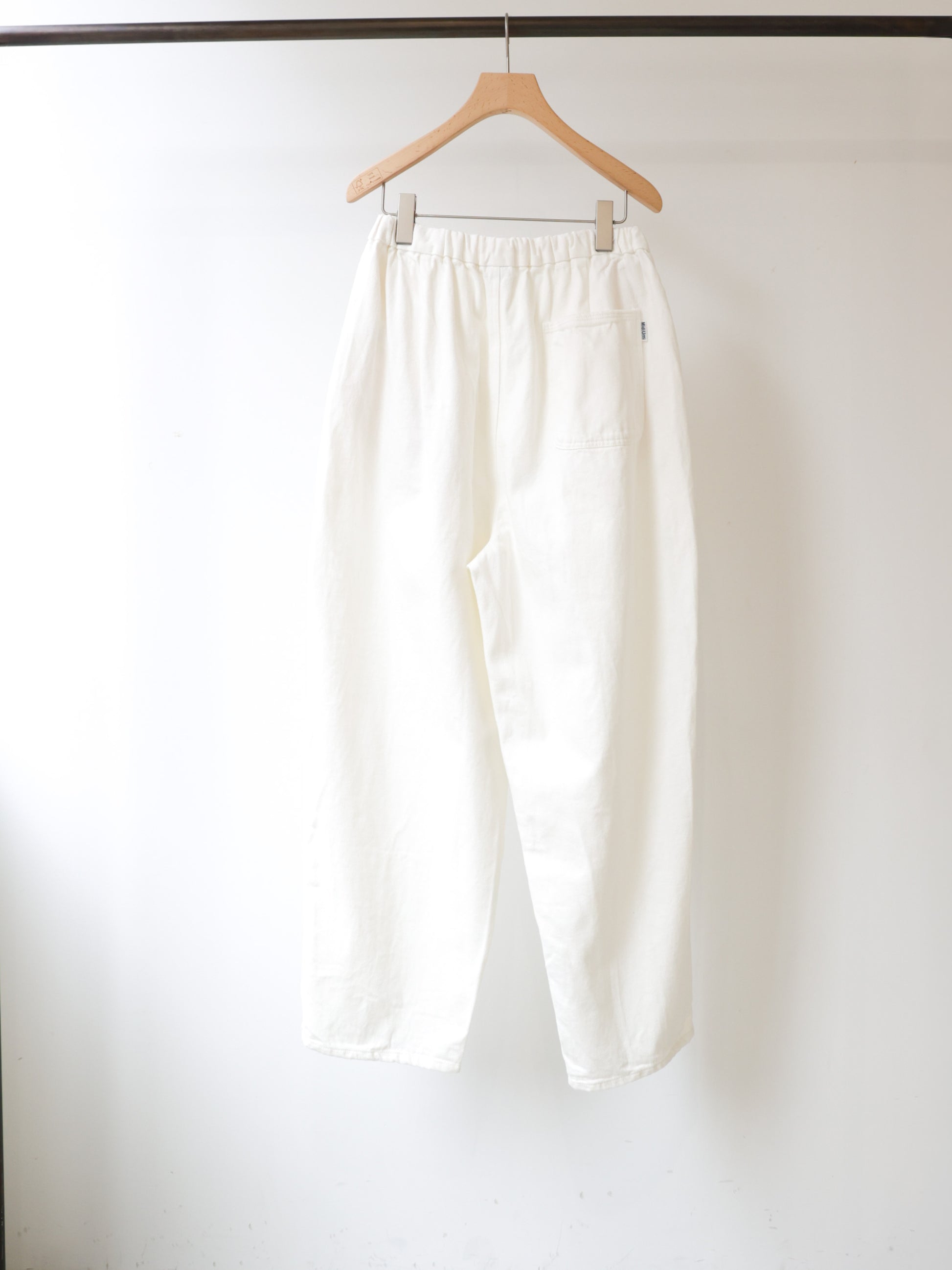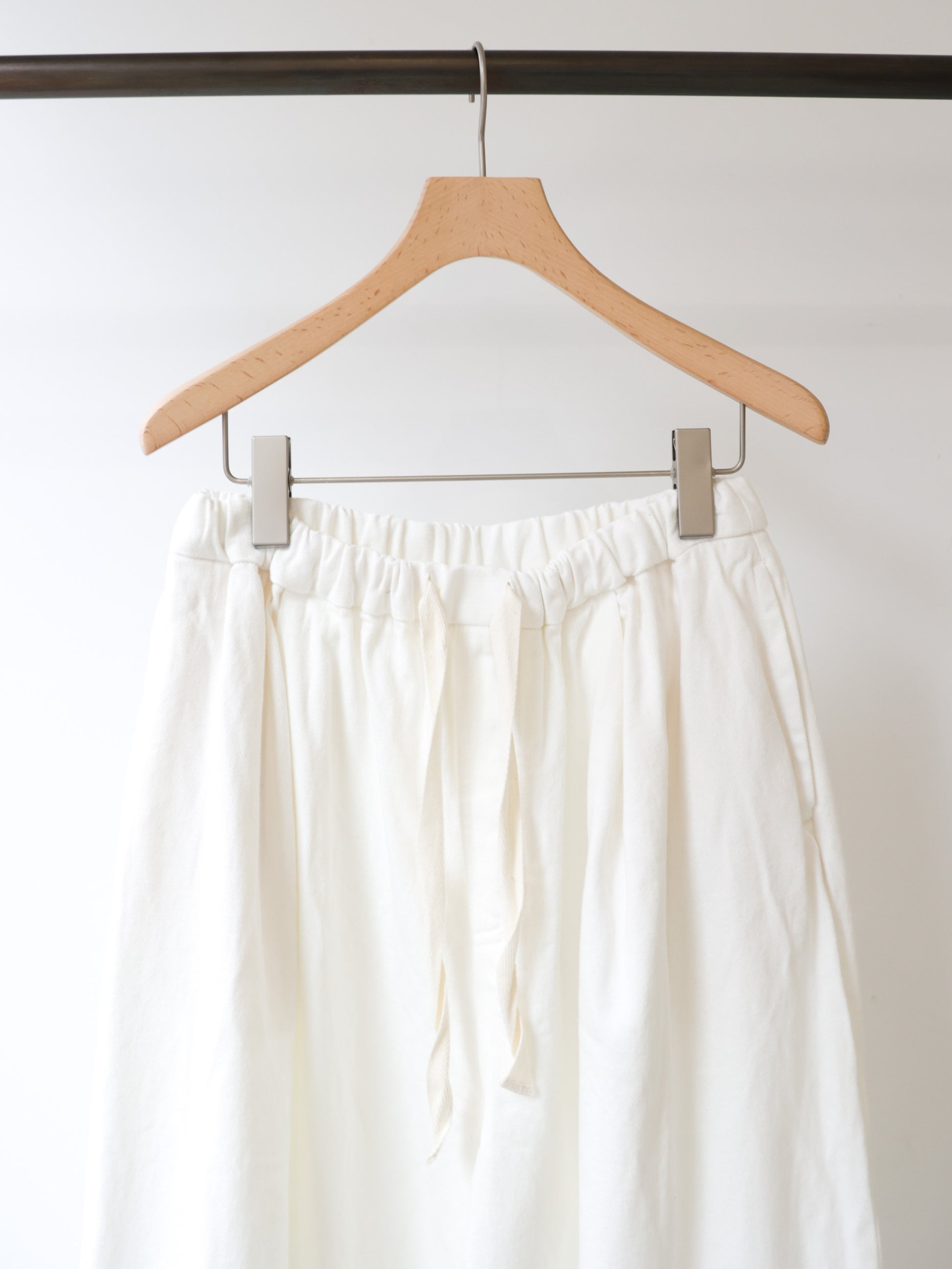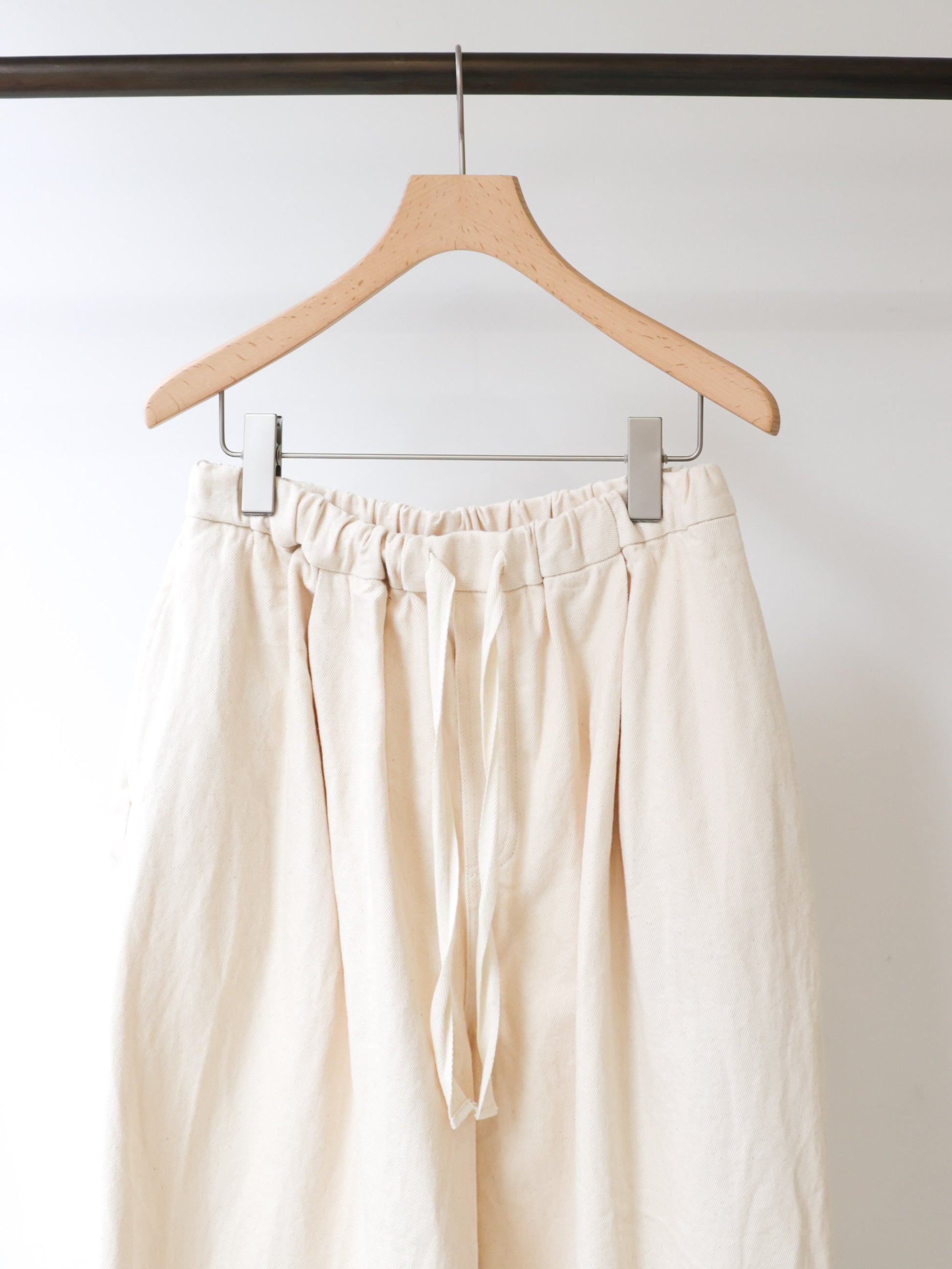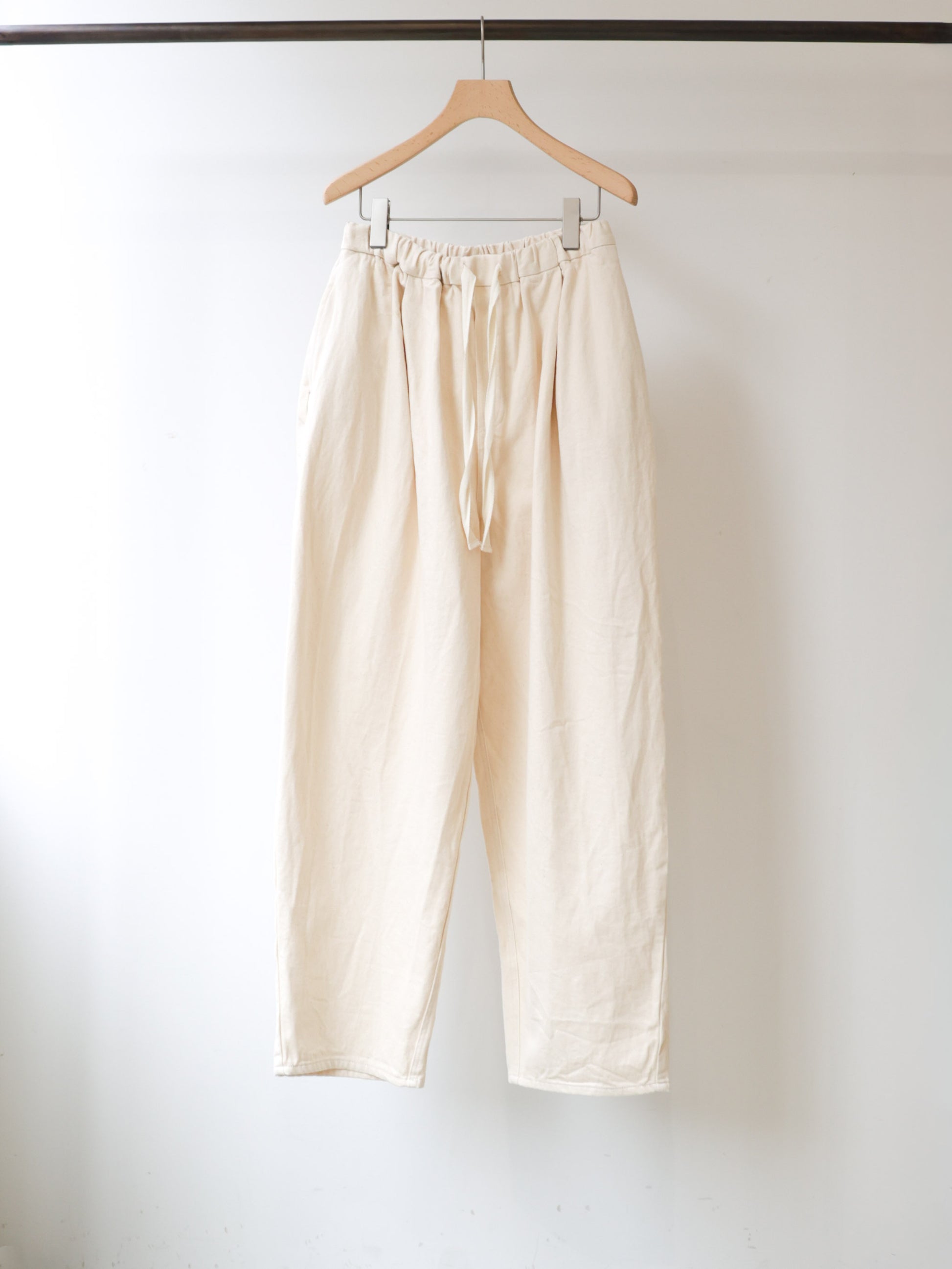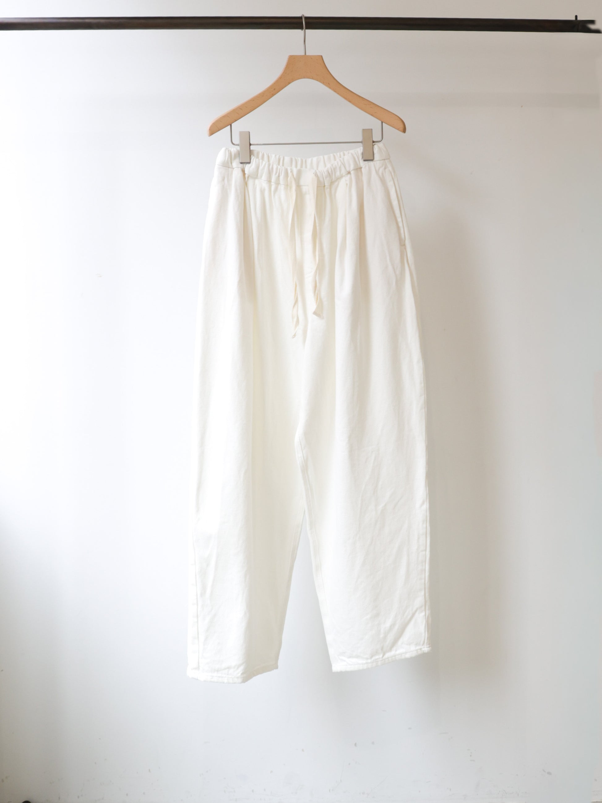 ウエストまわりにはたっぷりとゆとりを持たせ、裾に向かって細くなるテーパードシルエットを採用。