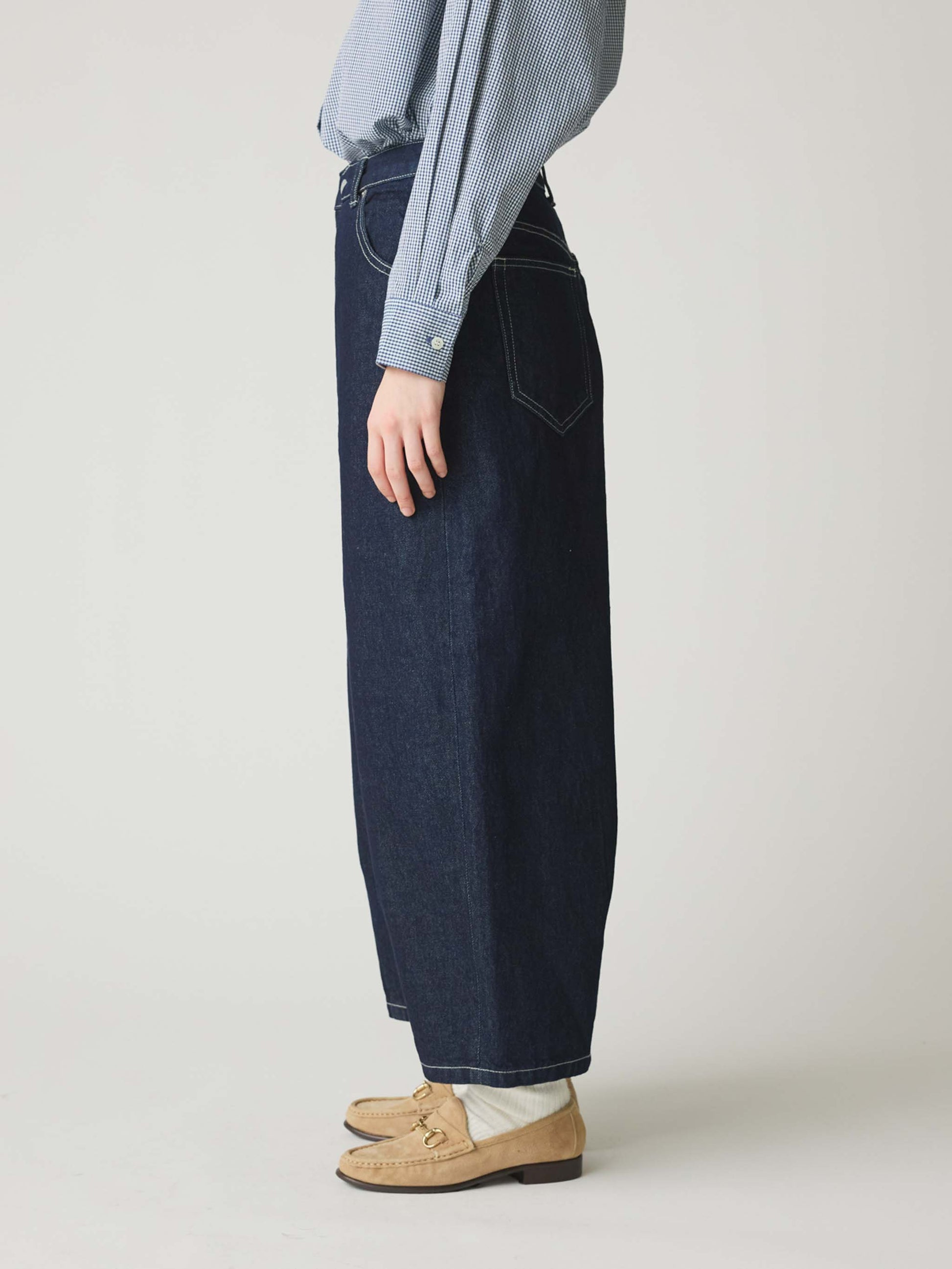 ハイウエストで丸みのあるワイドシルエットが特徴のデニム。