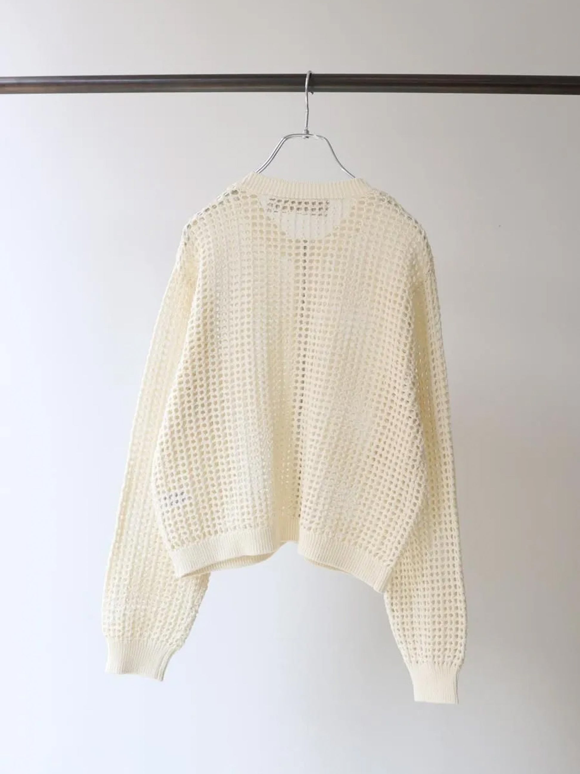 透け感のある編み地が軽やかさを演出し、シンプルながらもコーディネートのアクセントに。 フロントはジップ仕様で、着脱もしやすく、スタイリングに合わせて開け閉めで雰囲気を調整できます。