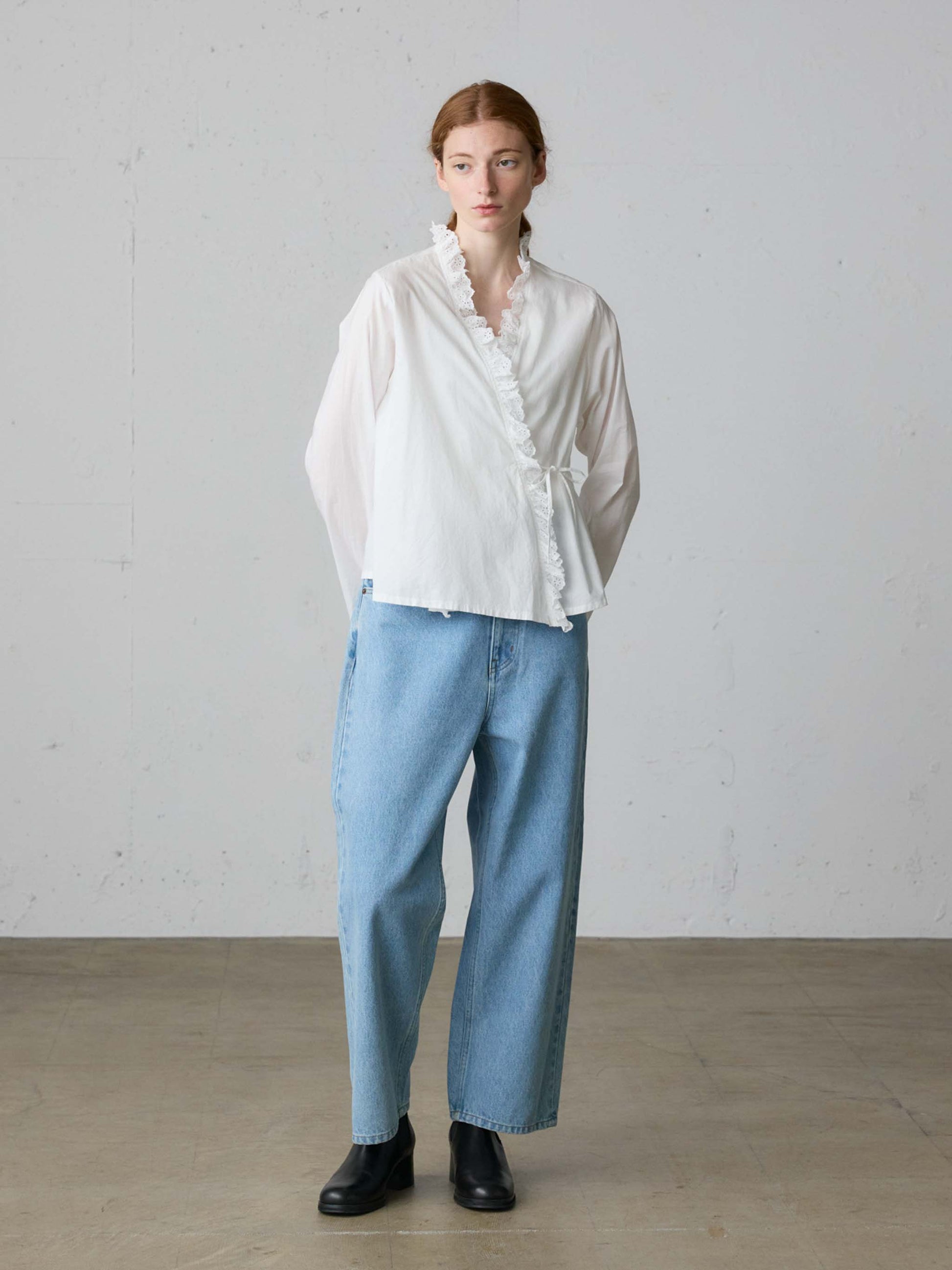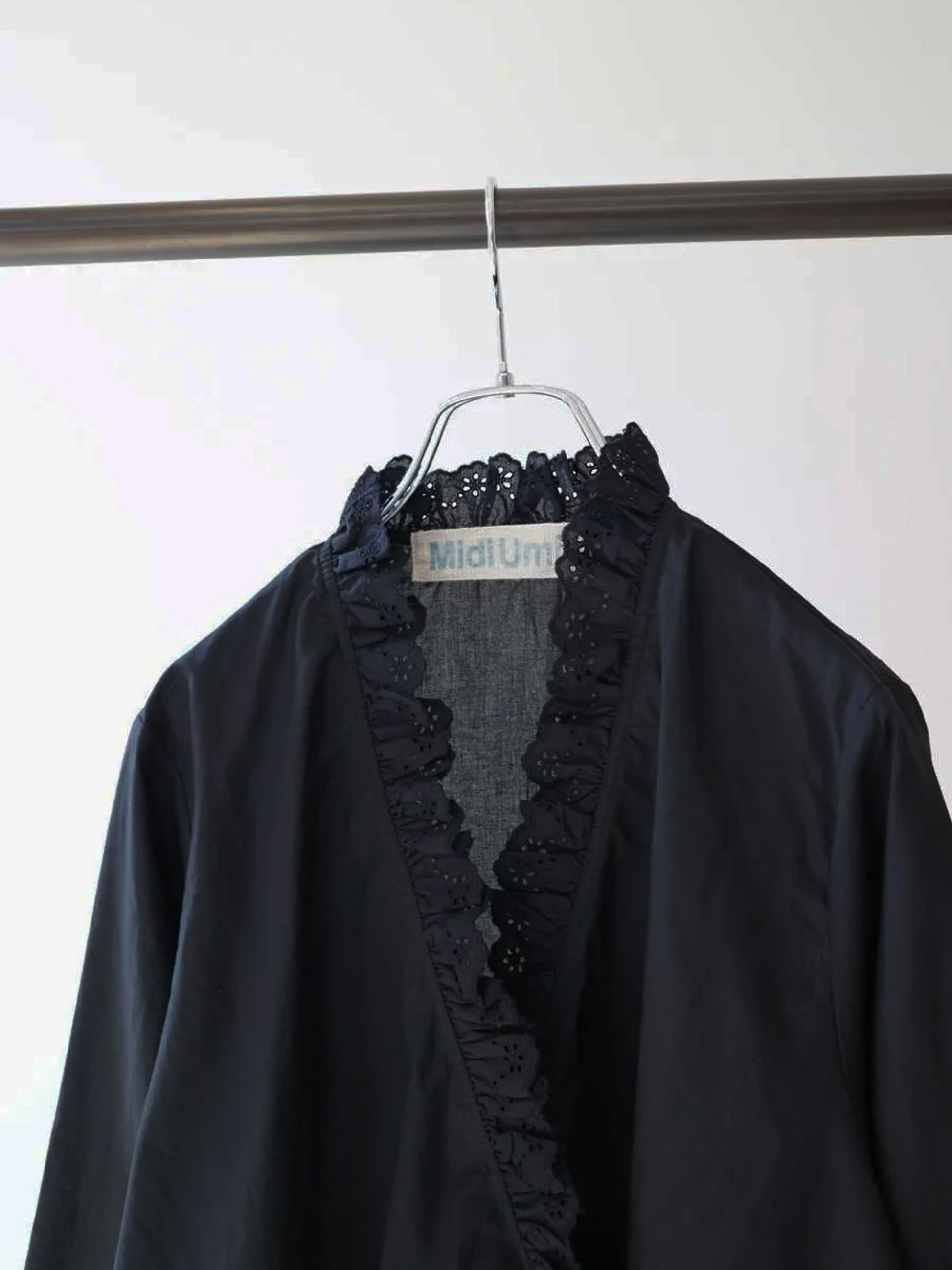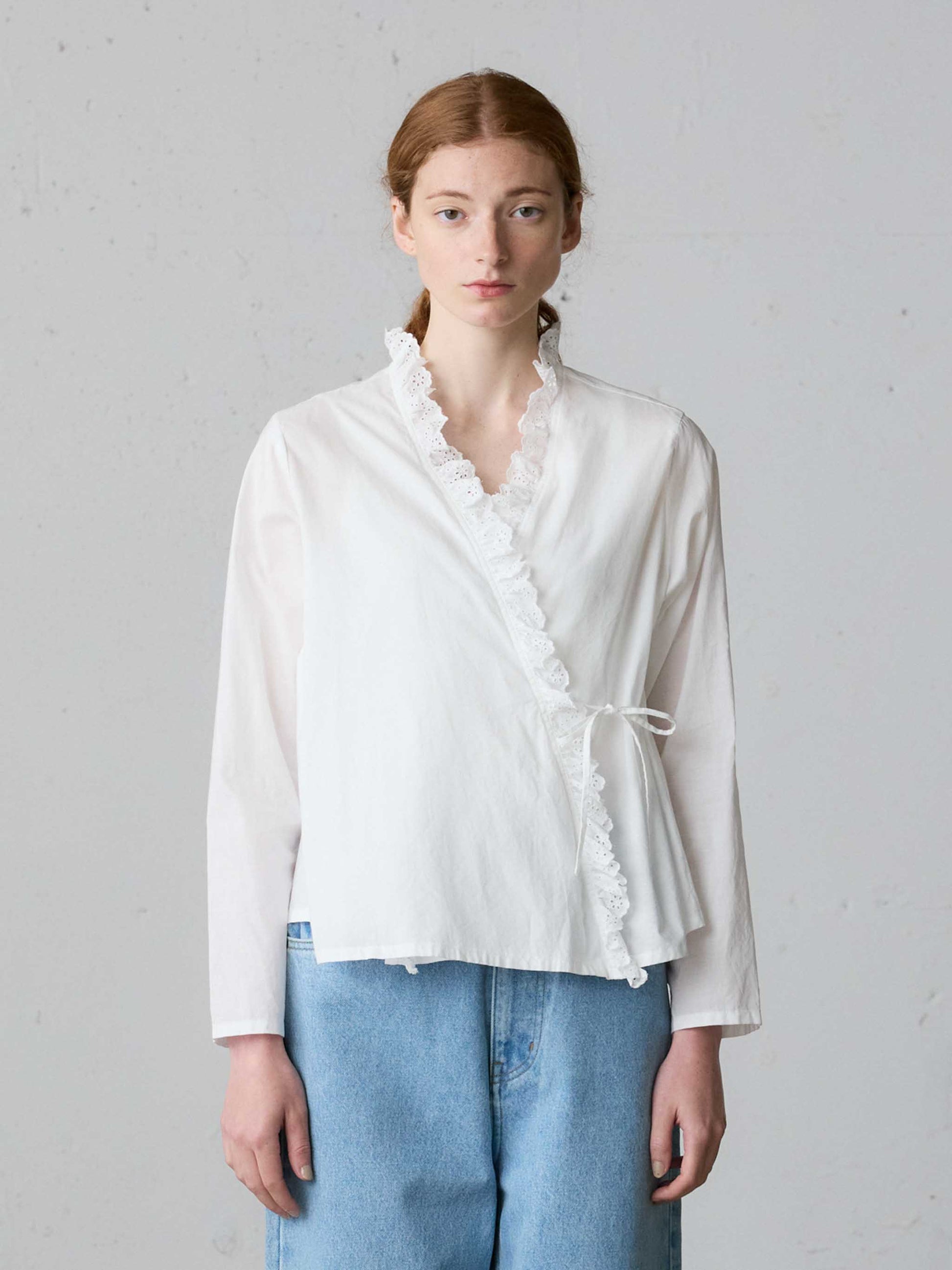 エンブロイダリーレースと60ローン素材を組み合わせた、 ヴィンテージ感あふれるカシュクールカーディガン。 襟元にはレースがあしらわれており、女性らしさを演出します。